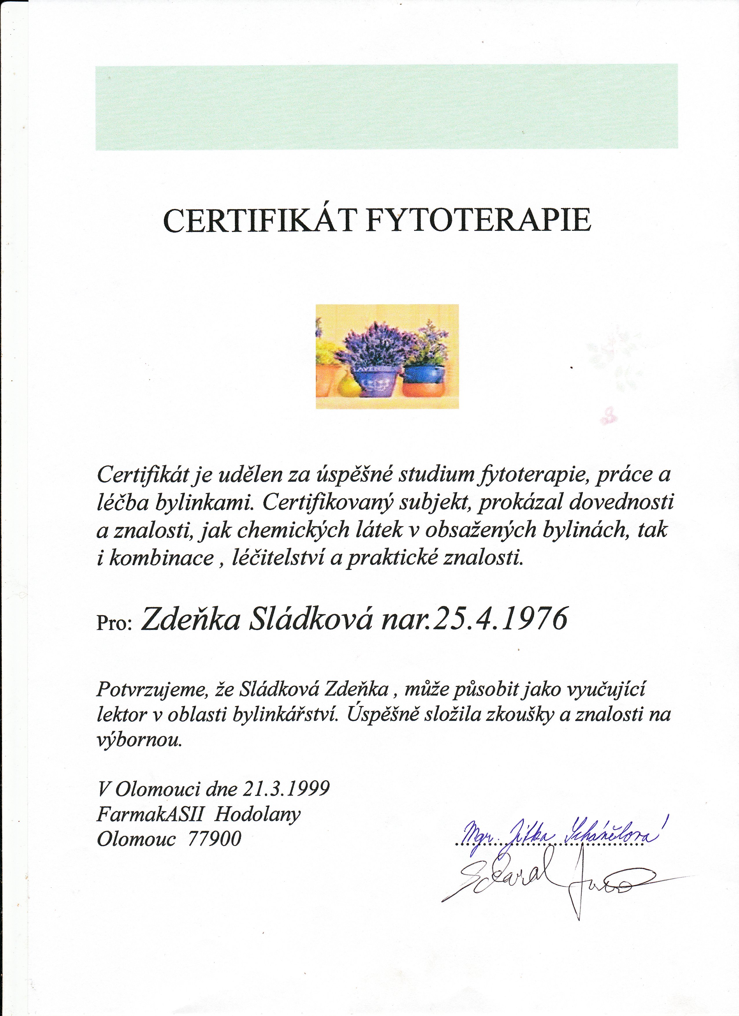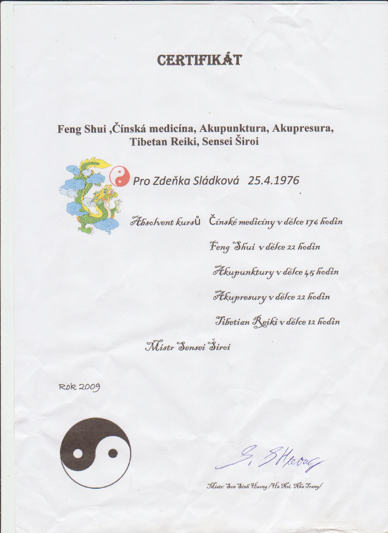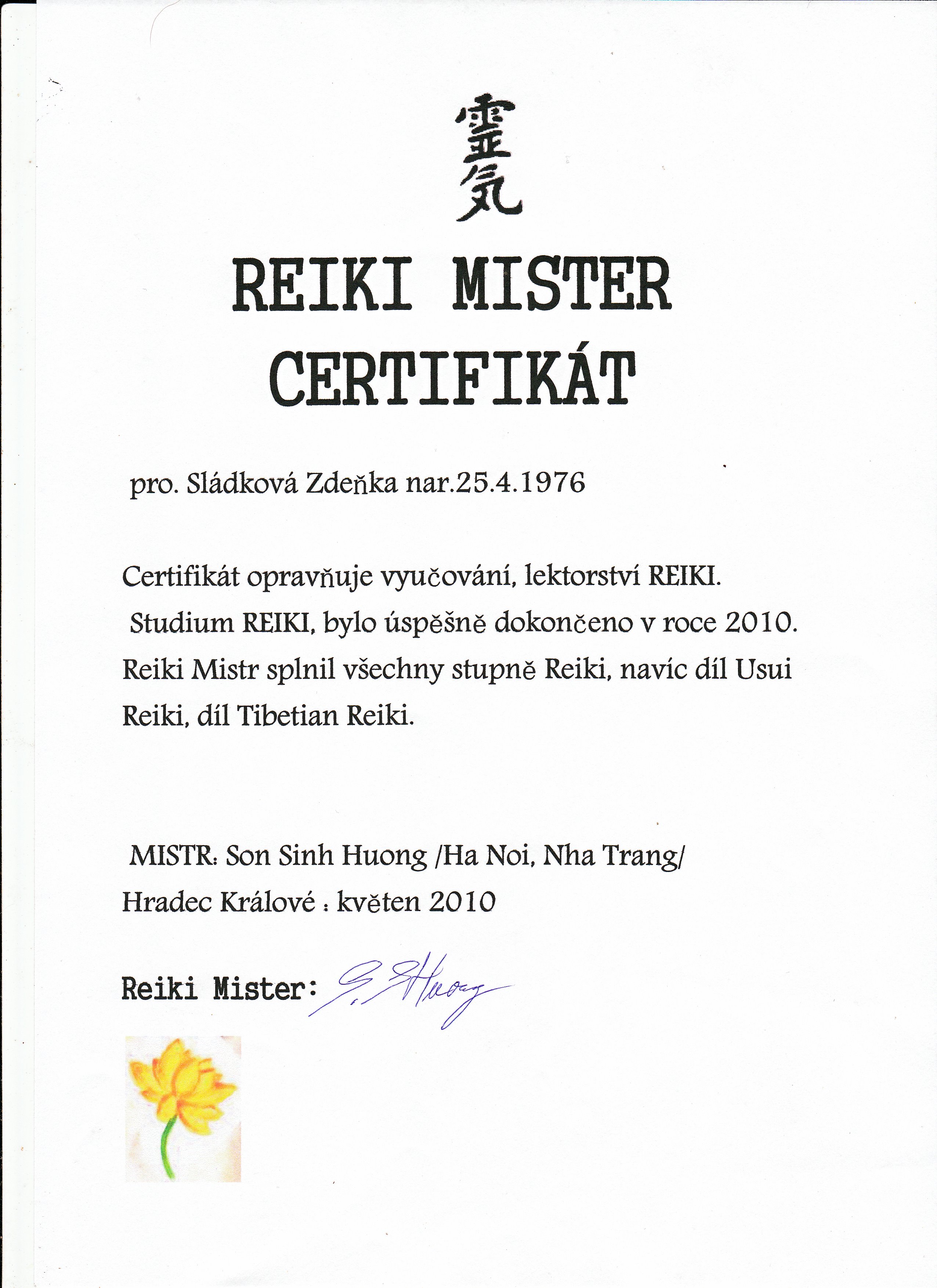 Postupem času mi život přinesl Certifikáty na Akášu, Čínskou medicínu, Feng Shui, Akupunkturu, Akupresuru, Tibetian Reiki, Fytoterapii - bylinkářství, pracuji s endogenním dýcháním, astrologií a léčím bolístky duše hlavně mým kamarádům a zvířátkům. Mým mistrem na Reiki byl Mistr Son Sinh Huong. S přírodou pracuji více než 20 let, kdy jsem začínala bojovými sporty, až Nin-po, mě přivedlo na cestu Reiki.